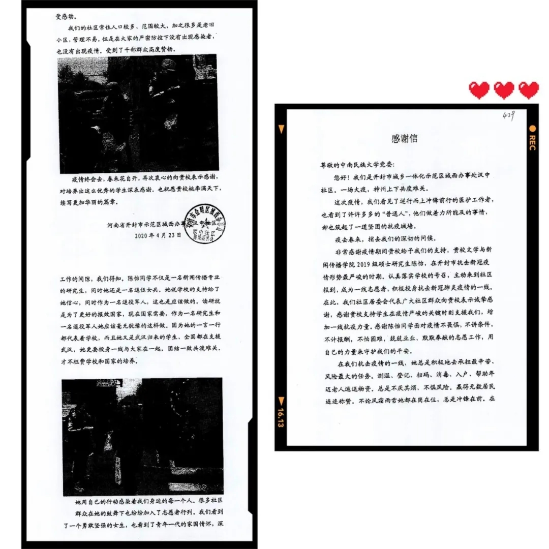 “在我們抗擊疫情的一線,她總是積極地去承擔最辛苦、風險最大的任務。不論風霜雨雪她都在崗在位,總是沖鋒在前。我們看到了一個堅強勇敢的女生,也看到了青年一代的家國情懷。”近日,一封從開封寄到中南民族大學的感謝信,讓大家認識了默默無聞、無私奉獻的青年志愿者陳怡。