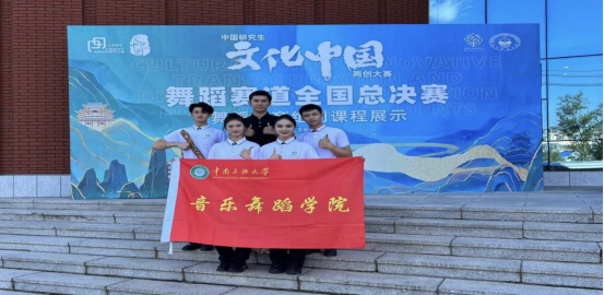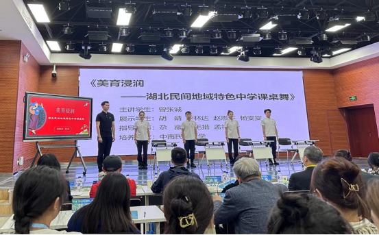 中國研究生“文化中國”兩創大賽的是中國研究生創新實踐系列大賽主題賽事之一,是系列大賽中首個文科主題的創新實踐公益性賽事。研究生院高度重視,積極響應并精心組織音樂舞蹈學院多個作品、課程參加大賽初賽申報,最終由音樂舞蹈學院尕藏教授、華毛措教授、孟祥宇老師擔任指導教師,2023級舞蹈教育方向研究生曾張誠作為主講學生,以及胡靖、李林達、趙恩菥、楊雯雯作為展示學生的《美育浸潤——湖北民間地域特色中學課桌舞》課程在全國的107門課程中脫穎而出,成功晉級全國總決賽。