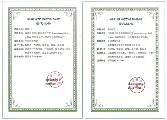近日,中南民族大學作為育種單位,本校藥學院萬定榮、楊新洲教授作為育種者,在多年研究基礎上,分別牽頭選育的兩個蘄艾新品種“蘄特1號”和“蘄特3號”,均獲得湖北省中藥材新品種鑒定證書。