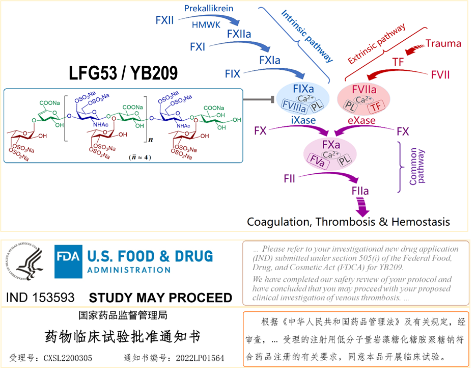 血栓性疾病是全球首位致死病因,抗血栓藥是其臨床治療的基石,現有抗血栓藥均存在“嚴重出血風險”的共性缺陷。本項目在低出血傾向抗凝藥物研發中取得系列原始創新和關鍵技術突破:① 以巖藻糖化糖胺聚糖(fucosylated glycosaminoglycan, FG)為先導化合物,通過半合成技術制備一系列FG寡糖衍生物,首次發現強效和選擇性的iXase抑制劑,iXase是內源性凝血途徑上的末位和限速酶活位點,是兼具低出血傾向和強效活性的優選抗凝藥物靶點;據此研發了國際上首個獲準進入臨床研究的iXase抑制劑類抗凝新藥(First-In-Class, FIC)LFG53。與“金標準”抗凝藥依諾肝素相比,LFG53的突出優勢是出血傾向顯著降低。② 首創糖苷鍵選擇性的解聚技術,突破FG確切結構解析的技術屏障,首次清晰呈現FG確切結構,澄清了盤亙數十年的FG結構的學術疑問;構建了特點鮮明的天然純品寡糖化合物庫,為基于純品寡糖化合物的活性篩選、構效關系分析以及新藥發現奠立了堅實的基礎。③ 以國際主流技術標準逐項創建了一系列非專利技術,成功逾越糖類藥物成藥性相關的技術壁壘,促成LFG53成功進入臨床研究;通過抑制靶蛋白的分子機制分析、凝血酶生成特點、選擇性凝血途徑影響、差異性的血栓和止血功能影響,清晰呈現了LFG53的低出血傾向的優勢特點及其藥理學機制。