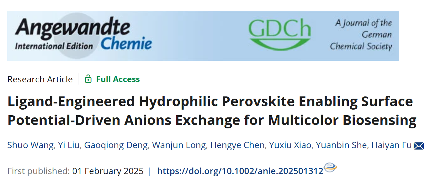 近日,國際著名期刊Angewandte Chemie International Edition發(fā)表我校藥學(xué)院付海燕教授團(tuán)隊(duì)在鈣鈦礦型多色生物傳感分析新方法及應(yīng)用的重要研究進(jìn)展。該研究成果以“Ligand-Engineered Hydrophilic Perovskite Enabling Surface Potential-Driven Anions Exchange for Multicolor Biosensing”為題發(fā)表。博士后王碩和碩士研究生劉易為論文共同第一作者,付海燕教授為唯一通訊作者,我校為唯一通訊單位。論文完成過程中還得到了浙江工業(yè)大學(xué)佘遠(yuǎn)斌教授和武漢大學(xué)肖玉秀教授的指導(dǎo)和支持。該研究受國家自然科學(xué)基金(32122068)、國家重點(diǎn)研發(fā)計(jì)劃(2023YFF1104002)等項(xiàng)目資助。