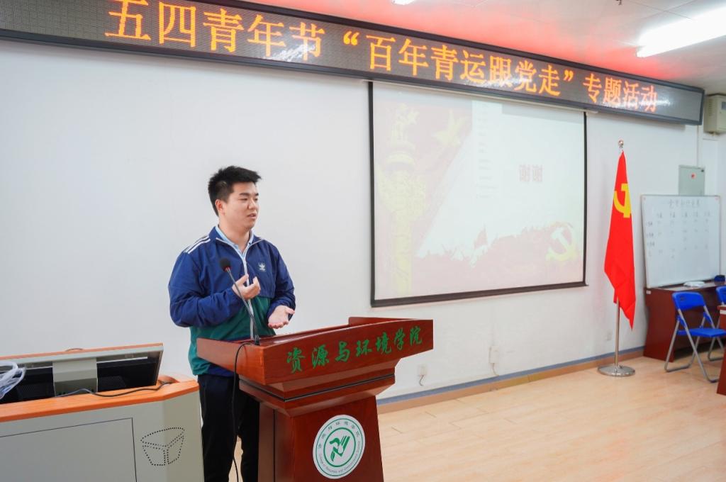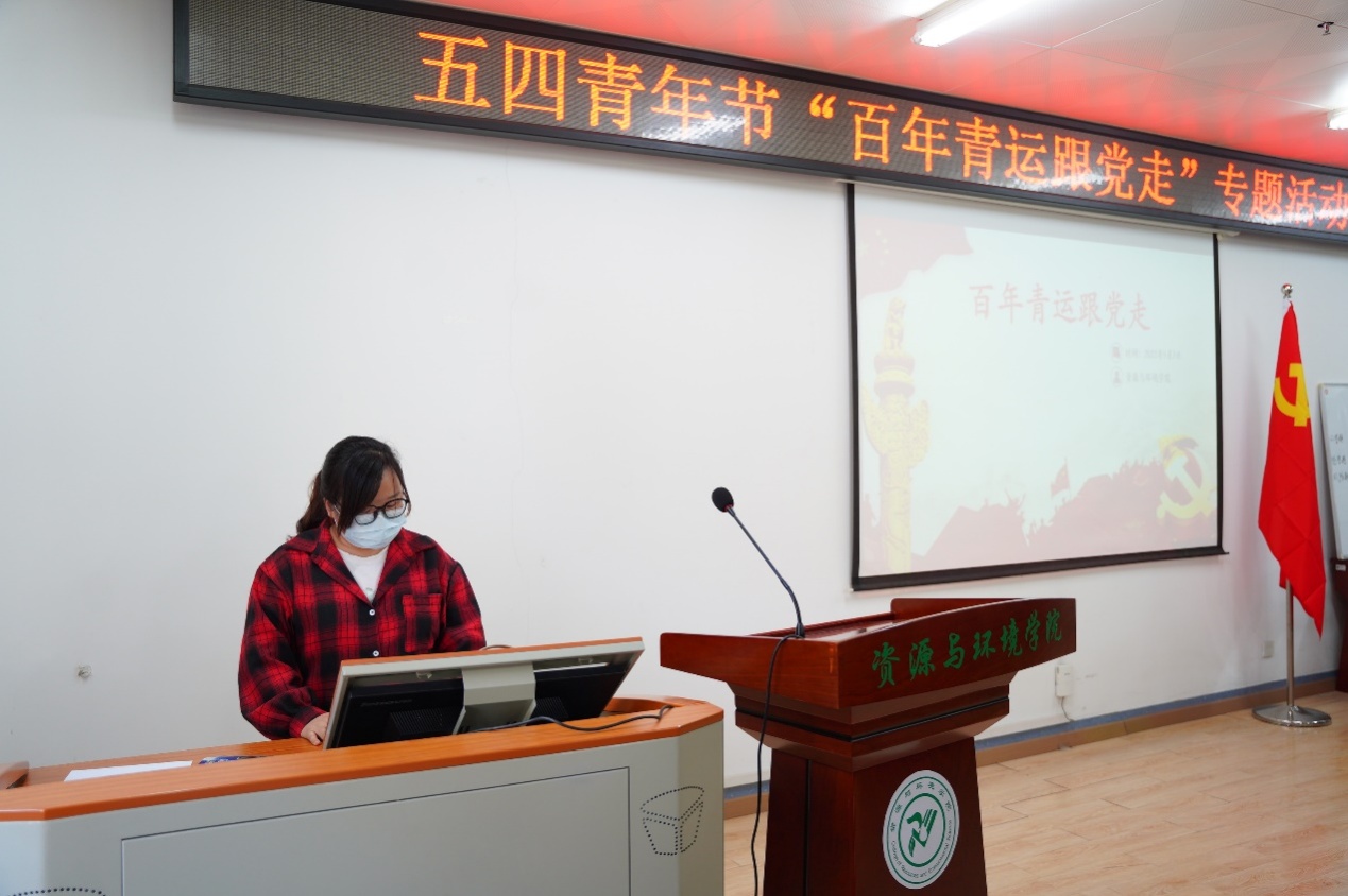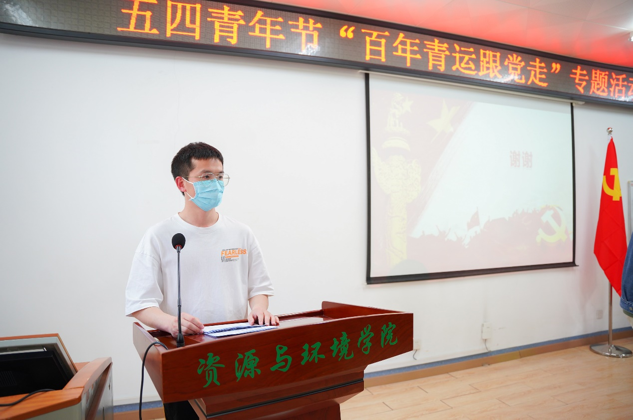 100年來,共青團始終牢記堅定不移跟黨走、為黨和人民事業不懈奮斗的初心和使命,堅持“黨有號召,團有行動”的光榮傳統,圍繞黨在不同歷史時期的中心任務,團結帶領一代又一代中國青年沖鋒在前、擔當作為,譜寫了一曲又一曲與人民同命運、與祖國共奮進的青春之歌。為進一步加強我院共青團組織的自身建設、弘揚五四愛國主義精神,資源與環境學院研究生黨支部于2022年5月3日在13-261報告廳組織召開“百年青運跟黨走”五四專題活動,參會對象為資源與環境學院全體研究生。