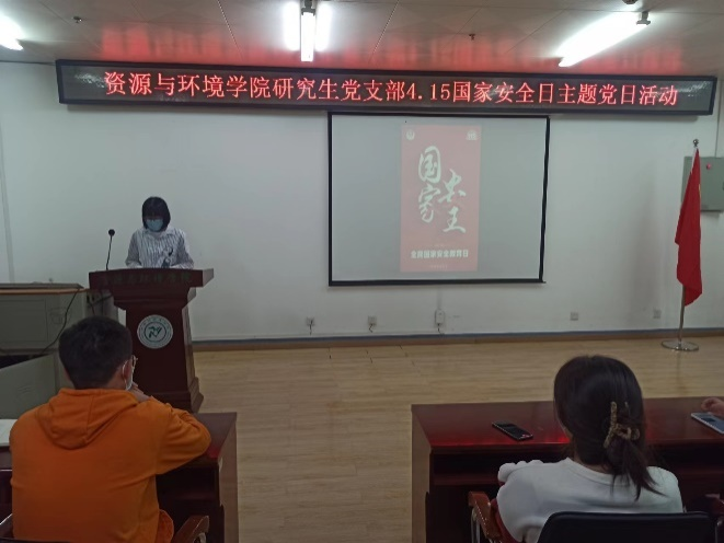 今年的4月15日是第七個全民國家安全教育日,為深入貫徹落實習近平總書記關于總體國家安全觀精神,2022年4月14日上午,資源與環境學院研究生黨支部在13號樓261報告廳組織召開擴大的“國家安全”支部主題黨日活動。本次活動由學院研究生黨支部副書記蘇海嵐同志主持,學院全體在校研究生參與了此次活動。會議伊始,蘇海嵐同志向大家講解了什么是總體國家安全觀,并強調人民安全是國家安全的宗旨。