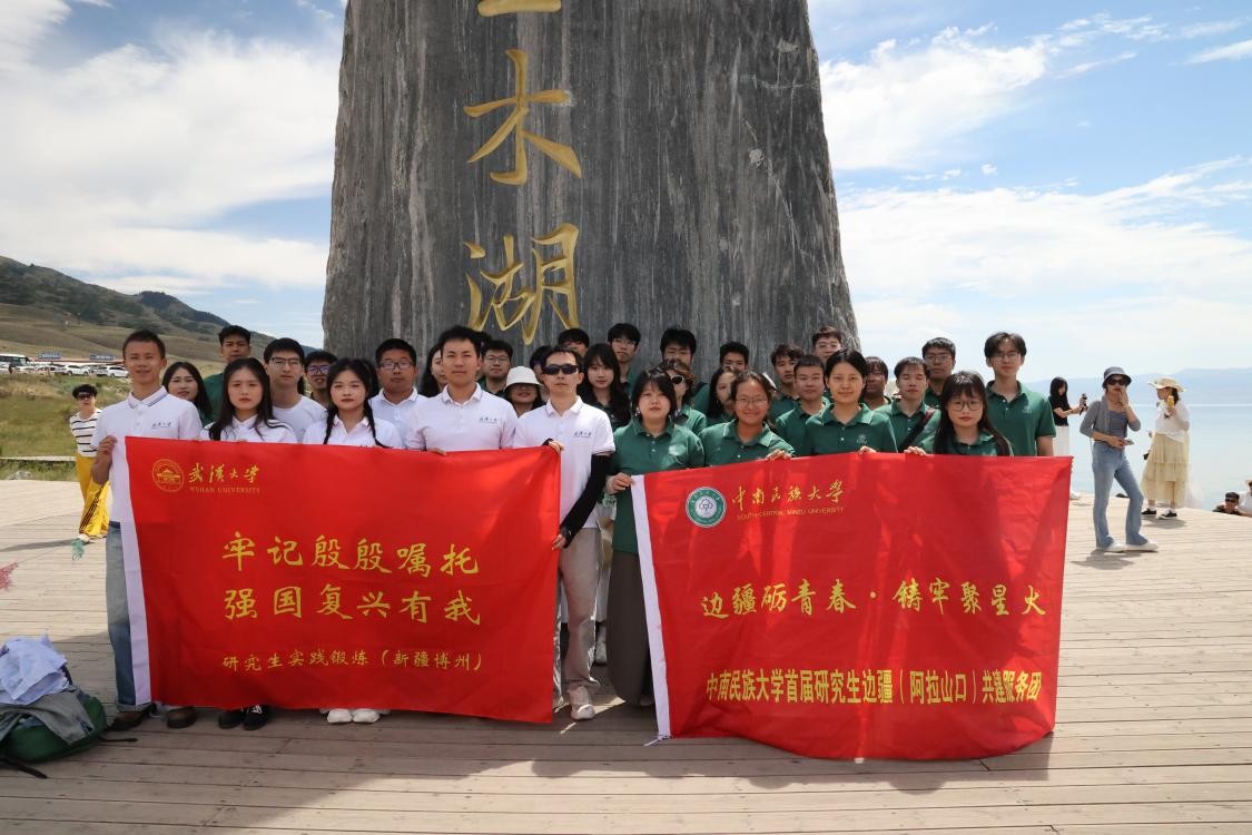 武漢大學實踐隊、中南民族大學邊疆共建服務團在賽里木湖合影(前排右一是李詩倩同學)