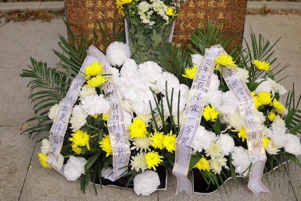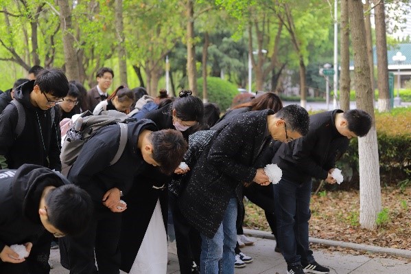 隨后,全體成員肅立默哀一分鐘,接著師生一道向吳澤霖先生雕像三鞠躬,獻(xiàn)上一對(duì)花籃和師生們親手制作的白花,以表達(dá)深深感激和無限哀思之情。