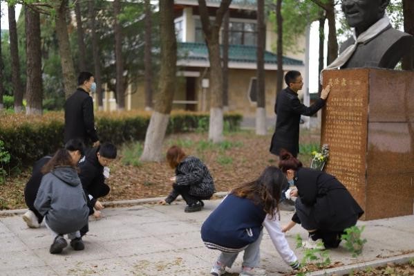 7時(shí)許,迎著清晨的第一縷陽光,師生一行來到博物館前吳澤霖先生雕像處,他們首先為先生的雕像拂塵除漬,清理附近環(huán)境。在莊嚴(yán)肅穆的氛圍中,全體師生手捧親手制作的白花,肅立在吳澤霖先生的雕像前,向吳老先生致以最崇高的敬意與追思。