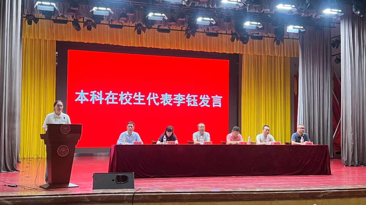本科在校生代表、環科專業2021級學生李鈺分享了自己在大學三年的成長歷程。她從學業、科研、社會服務三方面介紹自己的收獲和感想,鼓勵新生積極嘗試,全面發展自己。