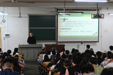 在2022級學生年級大會上,黃晴老師從升學就業情況、畢業升學要求和思想意識學習等三個方面為同學們進行講解介紹。他表示面對激烈的競爭現狀和愈加嚴峻的就業形勢,同學們應該端正心態、拒絕焦慮,開闊眼界、踔厲奮發,努力提升自身能力和綜合素質,既要認真查看個人培養方案完成情況,更要合理規劃好未來路徑,為順利畢業與就業打下良好基礎。