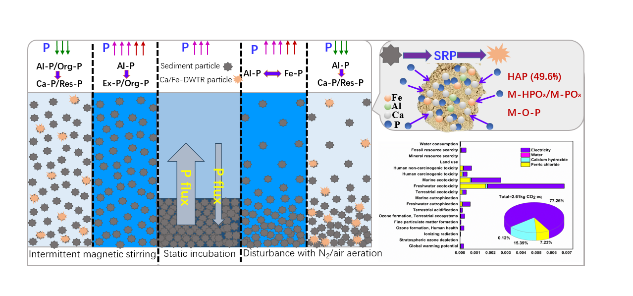 湖泊富營養化是全球面臨的重大水環境問題,沉積物中積累的磷作為內源性污染源,在擾動、缺氧等不利環境條件下極易釋放,持續加劇水華爆發。在淺水湖泊中,沉積物再懸浮(如風浪擾動)與缺氧、pH值升高等不利條件還經常形成協同效應,這使得傳統磷鈍化劑在這些多重環境動態應力條件下表現出有限的吸附能力和穩定性。飲用水處理殘余物(DWTR)作為水處理過程中的副產物,雖具備磷吸附潛力,但未改性材料的吸附容量和抗干擾能力有限,難以滿足實際修復需求。該研究針對淺水湖泊缺氧-擾動雙重脅迫下的沉積物磷釋放問題,開發了一種新型鈣鐵共改性飲用水處理殘余物(Ca/Fe-DWTR),為富營養化湖泊生態修復提供了高效且環境友好的技術方案。