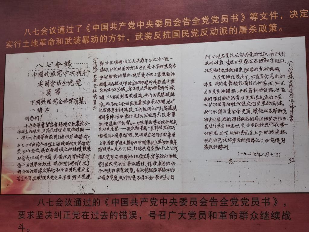 “八七會議”是黨史上一個重要轉(zhuǎn)折點(diǎn),會議總結(jié)了大革命失敗的教訓(xùn),確立實(shí)行土地革命和武裝起義的方針,毛澤東同志在會上提出了“槍桿子里面出政權(quán)”的著名論斷,中國革命從此開始由大革命失敗到土地革命戰(zhàn)爭興起的歷史性轉(zhuǎn)變。紀(jì)念館里的大量的文獻(xiàn)、圖片、視頻資料將同志們帶回了那個波瀾壯闊、風(fēng)云突變的時代,真切觸摸到了那段難忘的歷史,讓大家深刻地感受到了信仰的力量、團(tuán)結(jié)的力量和人民的力量。